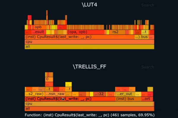 "I wrote a Yosys plugin to generate a flame graph for each cell type used in the design and combine it all in a single HTML page," Frans explains. "It's made as a Yosys plugin which gathers all the cell mappings, then passes those to a Rust library which does the flame graph stuff using the Inferno crate.