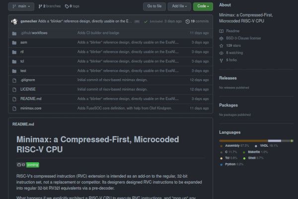 "'Minimax' is an experimental RISC-V implementation intended to establish if an RVC-optimised CPU is, in practice, any simpler than an ordinary RV32I core with pre-decoder," Graeme continues. "While it passes a modest test suite, you should not use it without caution."