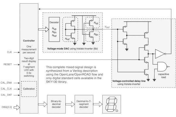 Matt's epiphany came about when Harald Pretl submitted a temperature sensor to the third iteration of the Tiny Tapeout project, creating a mixed-signal chip using Verilog and only the digital standard cells available in the Skywater SKY130 library.