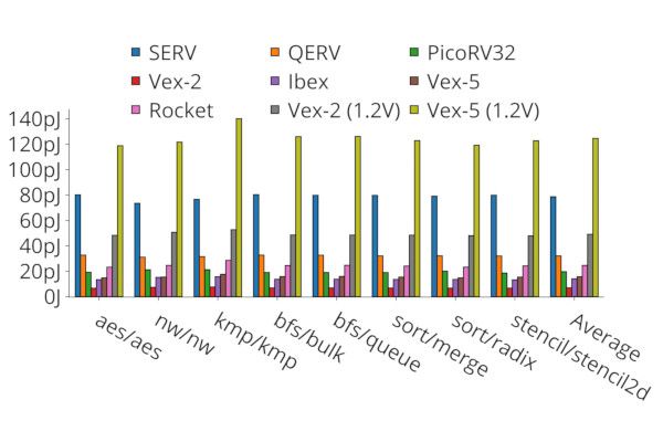 “Our goal in this paper is to understand how to maximise energy efficiency when designing standard-ISA processor cores for sub-threshold operation,” the team explains. "We hence develop a custom sub-threshold library and use it to synthesise the open-source RISC-V cores SERV, QERV, PicoRV32, Ibex, Rocket, and two variants of Vex, targeting a supply voltage of 300mV in a commercial 130nm process. SERV, QERV, and PicoRV32 are multi-cycle architectures, while Ibex, Vex, and Rocket are pipelined architectures.