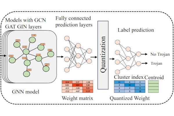 “We propose a novel framework that generates graph embeddings for large designs (e.g., RISC-V) and incorporates various GNN models tailored for HT detection. Furthermore, our framework introduces domain-specific techniques for efficient training and inference by implementing model quantisation. Model quantisation reduces the precision of the weights, lowering the computational requirements, enhancing processing speed without significantly affecting detection accuracy.”