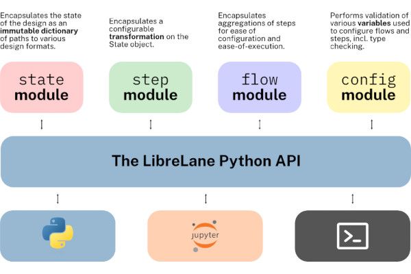 We designed LibreLane with three goals in mind. The first and most important principle is to retain the ease-of-use for OpenLane: Like OpenLane, LibreLane allows flows to be configured entirely with one Tcl, JSON or YAML file that allows you to get from RTL-to-GDSII. We also wanted to remain “batteries-included”: we continued to pursue methods of bunding flows with their requisite binaries so users would not have to go and build each tool, or be affected by API and or functionality breaks. Last, setting LibreLane apart from OpenLane, we wanted a well-documented API with which users can create their own flows.